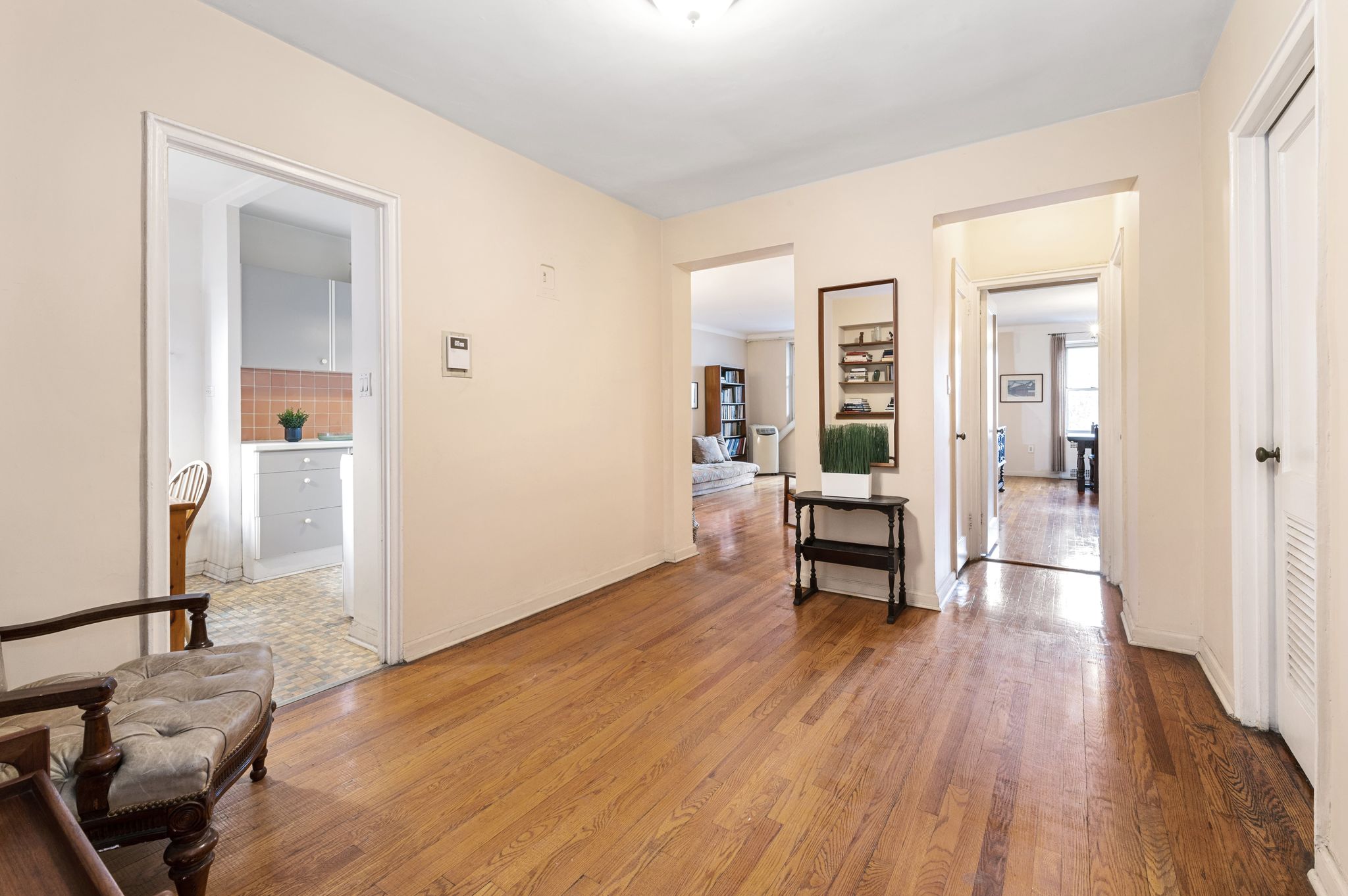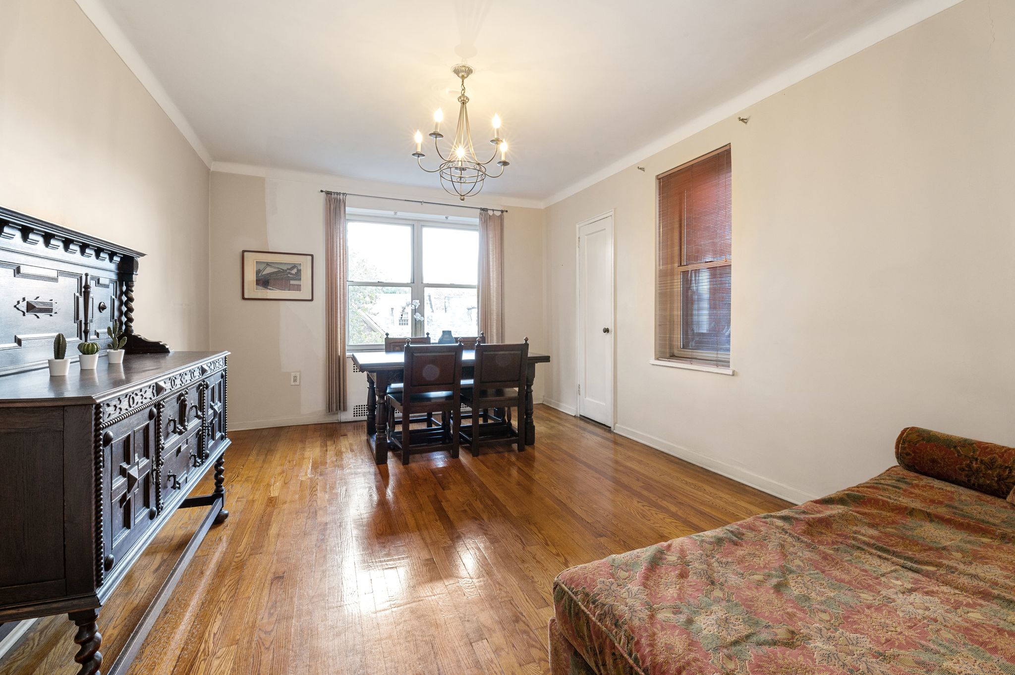 Located in the charming historic district of Jackson Heights, this peaceful corner apartment in The Carlton House boasts three exposures, facing East, West, and North. Upon entering, the beautiful hardwood flooring leads you to a versatile foyer that can be used as a home office, reading nook, or formal dining area. The spacious living room receives ample sunlight and features a stunning balcony with glass French doors, providing a private outdoor space with views of English garden homes, making it perfect for a relaxing Sunday afternoon with a good book. The windowed eat-in kitchen has a dining area that can… Read Moreeasily accommodate a table for four. The primary bedroom is impressive in size and has enough space for a king-sized bed and furniture set. Additionally, two closets in the bedroom and three more throughout the apartment provide ample storage. The bathroom boasts both a tub and a stand-up shower, with entries from the hall and the second bedroom. With eight windows and a balcony, this corner unit receives natural sunlight throughout the day, creating a bright and welcoming atmosphere.