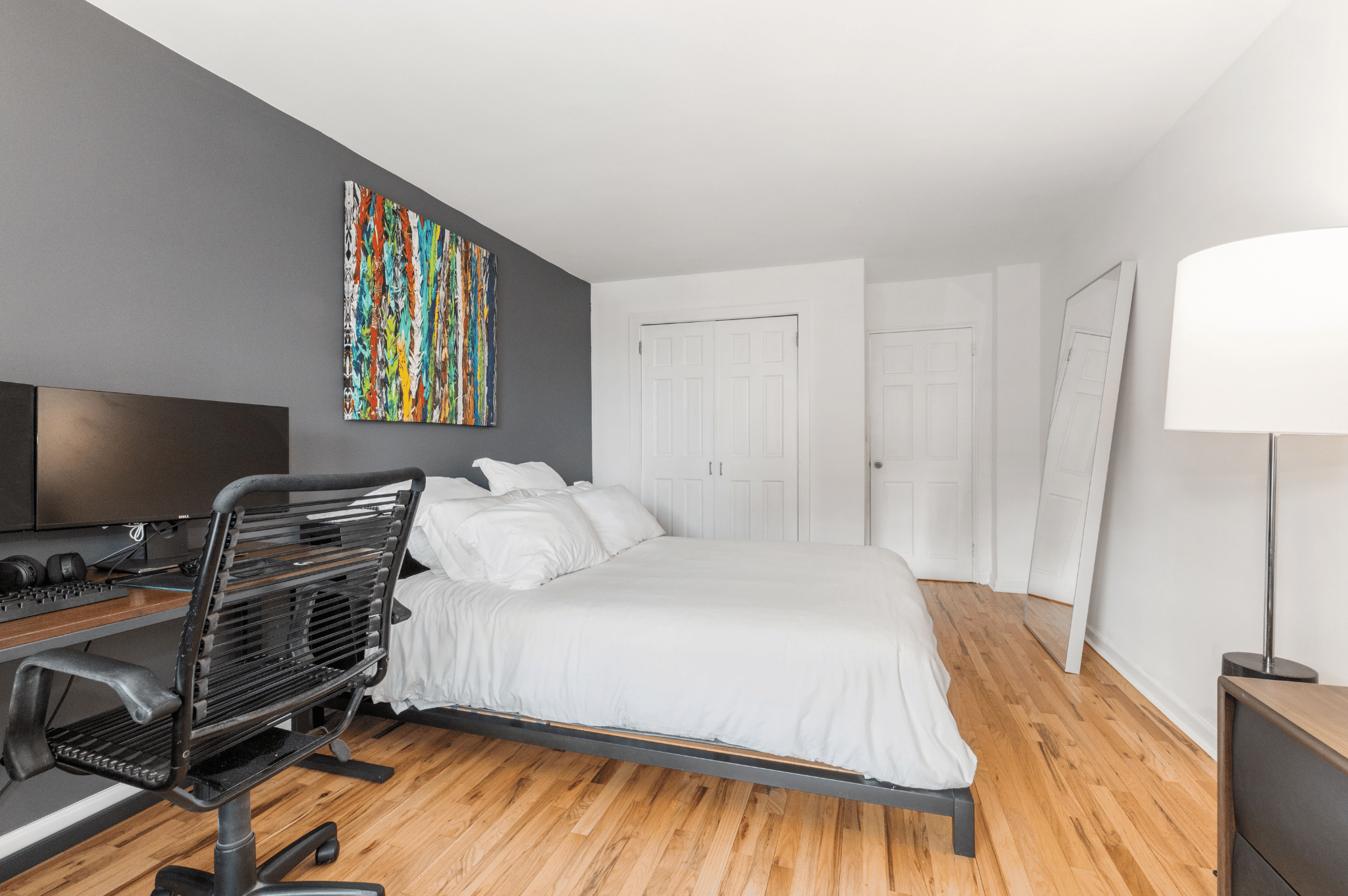 Step inside to a home that feels open and easy to live in, with a layout that clearly separates the living, dining, and sleeping areas. An entry foyer that doubles as a mudroom welcomes you and features a large walk-in closet, providing ample storage from the moment you arrive. The living room is notably spacious, anchored by an accent wall and a wall of glass at the far end—windows and a glass door that lead directly to the covered balcony. The balcony is long and sheltered overhead, creating a comfortable outdoor extension of the home with space for seating and… Read Morethe potential to be enjoyed year-round. The apartment benefits from southeastern exposures, bringing natural light into the living spaces. Off the main living area, a dedicated dining area sits beside its own window, offering a distinct place for meals, working from home, or entertaining without crowding the living room. The windowed kitchen features shaker-style cabinetry, including white upper cabinets with glass-front display panels and darker lower cabinets, paired with quartz countertops and a multicolor glass mosaic tile backsplash that adds warmth and texture. Stainless steel appliances include a slide-in glass-top stove, over-the-range microwave, and refrigerator. The kitchen offers a generous amount of cabinetry for storage, along with additional storage and quartz countertop space on the opposite side, ideal for small appliances or additional preparation space. Tile flooring provides practicality for everyday cooking. The bedroom is well-proportioned, featuring a large window and a well-designed double-wide closet that provides ample storage. The bathroom features floor-to-ceiling porcelain tile, a recessed light in the shower area, a modern bar light fixture above a black medicine cabinet, and a vanity with storage. A well-organized closet just outside the bathroom offers additional storage. Throughout the apartment, you will find gorgeous hardwood flooring and new interior doors. The maintenance of $764.34 includes gas, electric, heat, taxes, and water. Roosevelt Terrace is a stellar, well-maintained mid-century co-op located in the Jackson Heights Historic District. The building is financially sound and offers a range of amenities, including indoor ($100) and outdoor ($68) parking, storage, a bike room, laundry, and a private playground for residents. Pets are welcome, though subletting is not permitted. Just moments from Travers Park, Paseo Park, and the Sunday Greenmarket, along with beloved neighborhood cafés and everyday conveniences, the location offers the perfect blend of city accessibility and true Jackson Heights community charm.Read Less