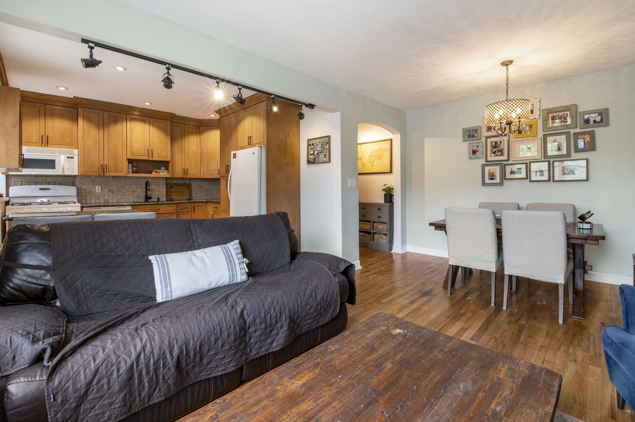 people. The tasteful track lighting gives a modern feel and separates the
