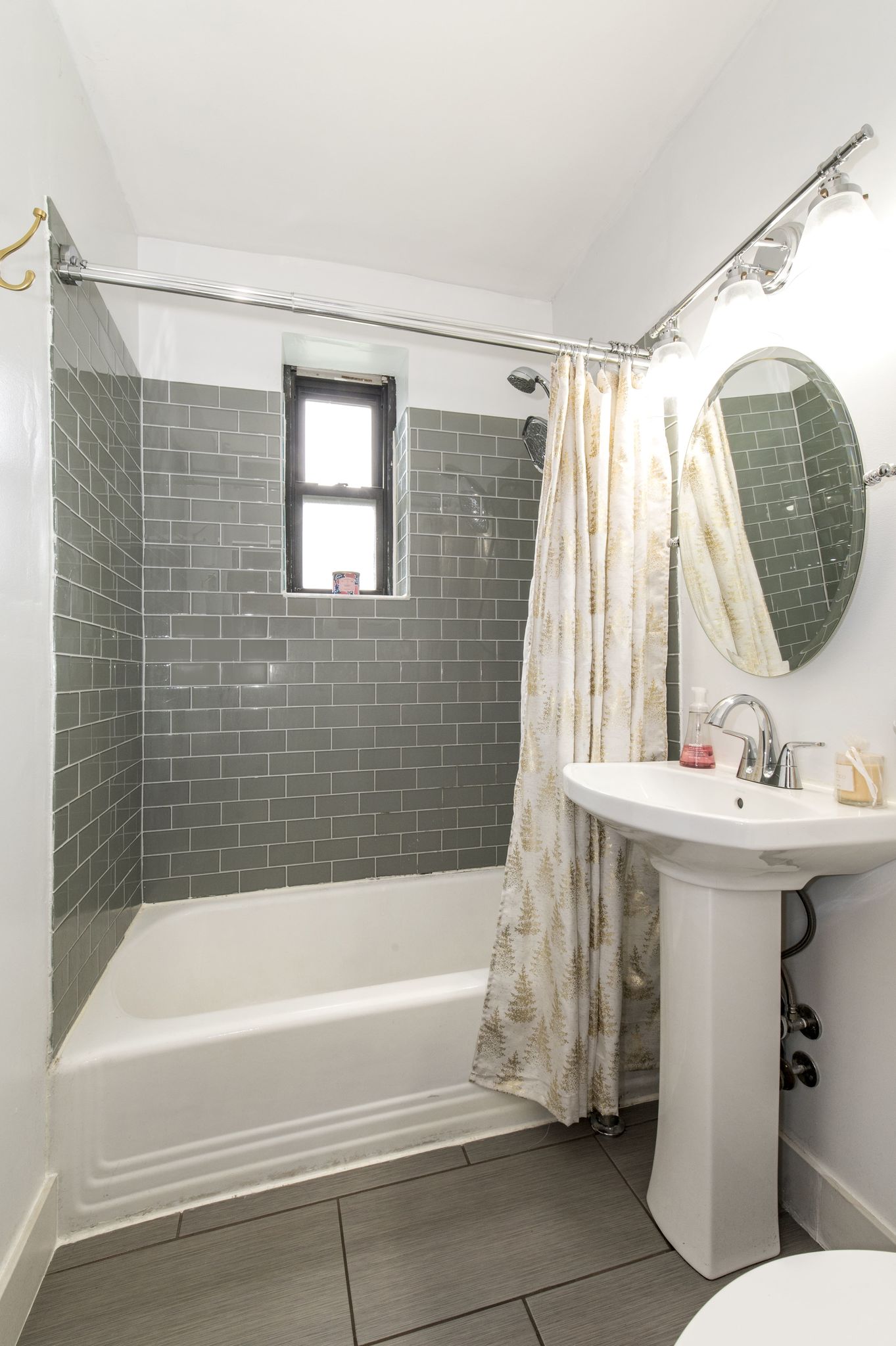 door for the bathroom, which conserves space. The newly updated subway tile in